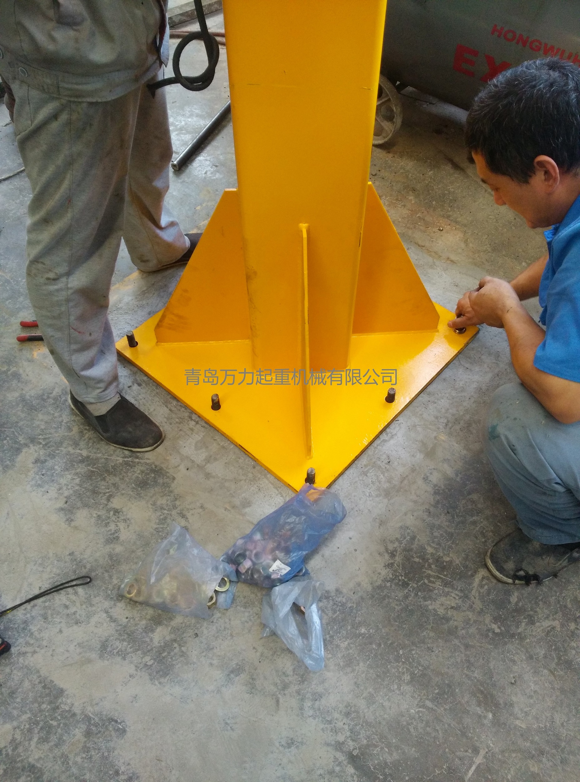 立柱式旋臂吊立桿選用方管或圓鋼管生產(chǎn)制造,兩邊分別電焊焊接底版和圓弧,上端安裝腰圈路軌。底版根據(jù)化學(xué)螺栓與水泥地面聯(lián)接固定不動(dòng),確保懸臂吊的可靠性。圓弧上打有形孔,建立電纜線從立桿內(nèi)部隱蔽工程裝線。