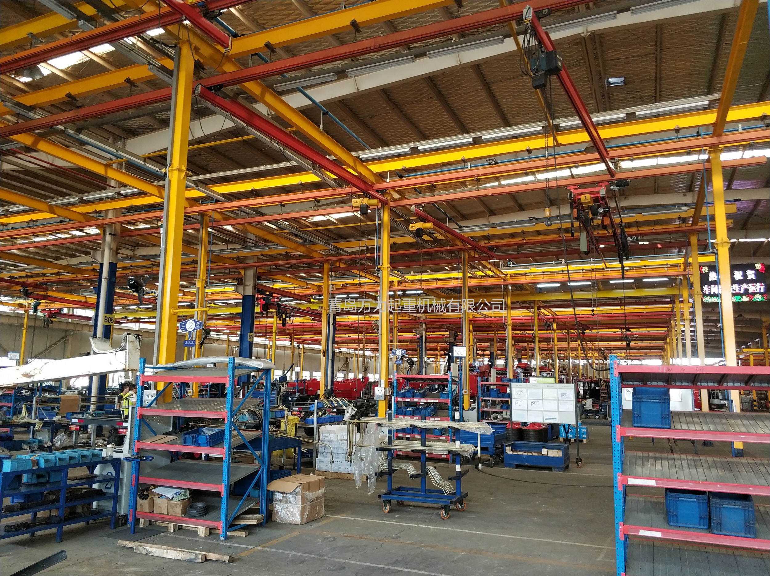 KBK,為Kombiniert Kran的縮寫,意為組合式起重機。主要由軌道、懸掛裝置、行走小車和一些功能組件構(gòu)成,所有模塊都為標準組件。起升裝置主要采用環(huán)鏈電動葫蘆,也可吊掛一些機械手或焊槍之類,作為工具滑軌使用。起重量一般為125kg-2000kg。KBK軌道-采用Ω形狀,2片焊接而成。常用的是KBKII型軌道,多根軌道可用高強度螺栓連接。彎軌的轉(zhuǎn)彎半徑1.5m,大彎可用直軌搭配。沒有更小半徑的,會對小車運行有影響。(KBKI型軌道轉(zhuǎn)彎半徑1m,在此不做介紹)。也可在KBKII型軌道內(nèi)側(cè)安裝內(nèi)置滑觸線,用于葫蘆供電,稱為KBKII-R型。懸掛裝置一般可以安裝在工字鋼/H型鋼下緣,有一定自鎖功能,安裝簡便牢靠。功能組件包括:道岔,十字轉(zhuǎn)盤,升降段等。KBK組合起重機包括-單軌起重機、-單梁起重機、-雙梁起重機、-伸縮梁、-堆垛機等各種型式的起重設備,起重量0.125t~2t適應范圍極廣,尤其適用于現(xiàn)代化生產(chǎn)輸送線,其特點概述如下: 1、可靠性好、穩(wěn)定性高 KBK輕型起重機系統(tǒng)的組成部件全部是標準模塊,可以保證大批量、高質(zhì)量生產(chǎn),因而系統(tǒng)十分可靠;系統(tǒng)模塊的主體是三種規(guī)格的冷軋型材,強度大,剛度好,自重輕,保證了系統(tǒng)的穩(wěn)定性。 2、適應能力強 KBK系統(tǒng)可根據(jù)工廠各工位的需要,靈活地設計安裝起重機系統(tǒng),從定點運送到高準確度地多點、多節(jié)拍的自動化輸送線,都能隨意組合而成??捎糜谛略O計的廠房,也可用于舊系統(tǒng)的改造或延伸。3、安裝方便,經(jīng)濟高效 KBK系統(tǒng)的安裝調(diào)試很方便,型材及各標準模塊之間只須用螺栓連接即可使用,可節(jié)省工廠的空間和面積,大大減少了人力資源,提高生產(chǎn)效率,從而降低能耗,提高企業(yè)效益。系統(tǒng)可以手動操作,也可以實現(xiàn)自動、半自動操作,運行高效。