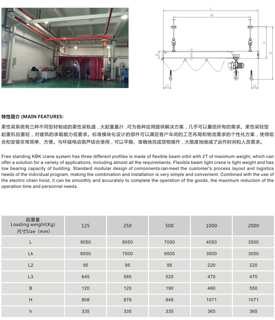 KBK,為KombiniertKran的縮寫,意為組合式起重機(jī),主要由軌道、懸掛裝置、行走小車和一些功能組件構(gòu)成,所有模塊都為標(biāo)準(zhǔn)組件。起升裝置主要采用環(huán)鏈電動(dòng)葫蘆,也可吊掛一些機(jī)械手或焊槍之類,作為工具滑軌使用,起重量一般為125kg-2000kg。KBK軌道采用Ω形狀,2片焊接而成。常用的是KBKII型軌道,多根軌道可用高強(qiáng)度螺栓連接。彎軌的轉(zhuǎn)彎半徑1.5m,大彎可用直軌搭配。沒(méi)有更小半徑的,會(huì)對(duì)小車運(yùn)行有影響。(KBKI型軌道轉(zhuǎn)彎半徑1m,在此不做介紹)。也可在KBKII型軌道內(nèi)側(cè)安裝內(nèi)置滑觸線,用于葫蘆供電,稱為KBKII-R型。懸掛裝置一般可以安裝在工字鋼/H型鋼下緣,有一定自鎖功能,安裝簡(jiǎn)便牢靠。功能組件包括:道岔,十字轉(zhuǎn)盤,升降段等。KBK組合起重機(jī)包括單軌起重機(jī)、單梁起重機(jī)、雙梁起重機(jī)、伸縮梁、堆垛機(jī)等各種型式的起重設(shè)備,起重量0.125t~2t適應(yīng)范圍極廣,尤其適用于現(xiàn)代化生產(chǎn)輸送線,其特點(diǎn)如下: