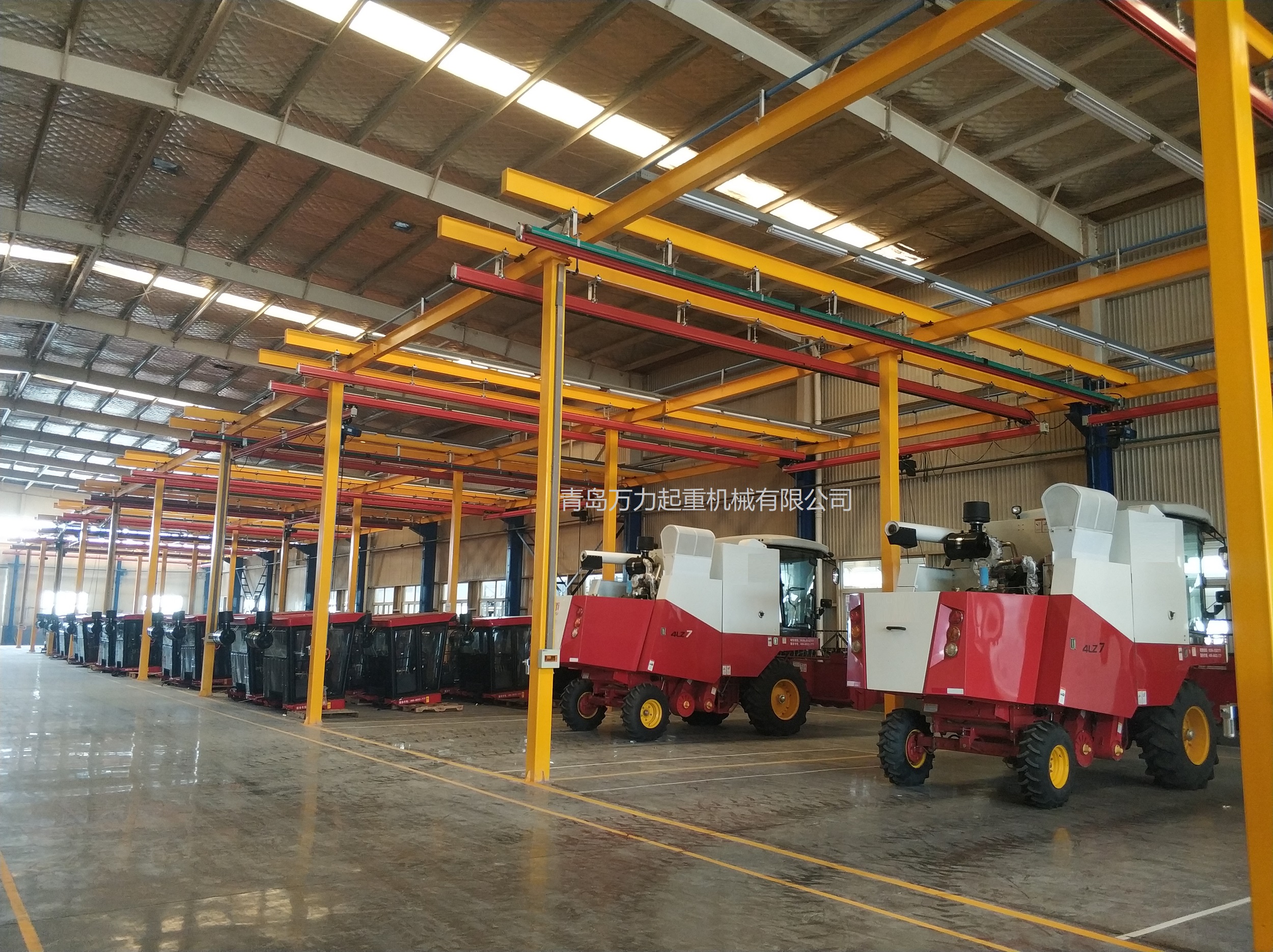 KBK,為Kombiniert Kran的縮寫,意為組合式起重機。主要由軌道、懸掛裝置、行走小車和一些功能組件構(gòu)成,所有模塊都為標準組件。起升裝置主要采用環(huán)鏈電動葫蘆,也可吊掛一些機械手或焊槍之類,作為工具滑軌使用。起重量一般為125kg-2000kg。KBK軌道-采用Ω形狀,2片焊接而成。常用的是KBKII型軌道,多根軌道可用高強度螺栓連接。彎軌的轉(zhuǎn)彎半徑1.5m,大彎可用直軌搭配。沒有更小半徑的,會對小車運行有影響。(KBKI型軌道轉(zhuǎn)彎半徑1m,在此不做介紹)。也可在KBKII型軌道內(nèi)側(cè)安裝內(nèi)置滑觸線,用于葫蘆供電,稱為KBKII-R型。懸掛裝置一般可以安裝在工字鋼/H型鋼下緣,有一定自鎖功能,安裝簡便牢靠。功能組件包括:道岔,十字轉(zhuǎn)盤,升降段等。KBK組合起重機包括-單軌起重機、-單梁起重機、-雙梁起重機、-伸縮梁、-堆垛機等各種型式的起重設備,起重量0.125t~2t適應范圍極廣,尤其適用于現(xiàn)代化生產(chǎn)輸送線,其特點概述如下: 1、可靠性好、穩(wěn)定性高 KBK輕型起重機系統(tǒng)的組成部件全部是標準模塊,可以保證大批量、高質(zhì)量生產(chǎn),因而系統(tǒng)十分可靠;系統(tǒng)模塊的主體是三種規(guī)格的冷軋型材,強度大,剛度好,自重輕,保證了系統(tǒng)的穩(wěn)定性。 2、適應能力強 KBK系統(tǒng)可根據(jù)工廠各工位的需要,靈活地設計安裝起重機系統(tǒng),從定點運送到高準確度地多點、多節(jié)拍的自動化輸送線,都能隨意組合而成??捎糜谛略O計的廠房,也可用于舊系統(tǒng)的改造或延伸。3、安裝方便,經(jīng)濟高效 KBK系統(tǒng)的安裝調(diào)試很方便,型材及各標準模塊之間只須用螺栓連接即可使用,可節(jié)省工廠的空間和面積,大大減少了人力資源,提高生產(chǎn)效率,從而降低能耗,提高企業(yè)效益。系統(tǒng)可以手動操作,也可以實現(xiàn)自動、半自動操作,運行高效。